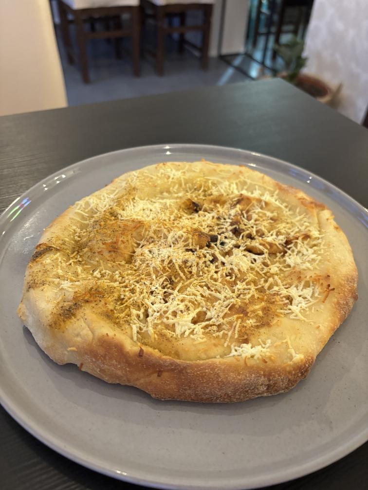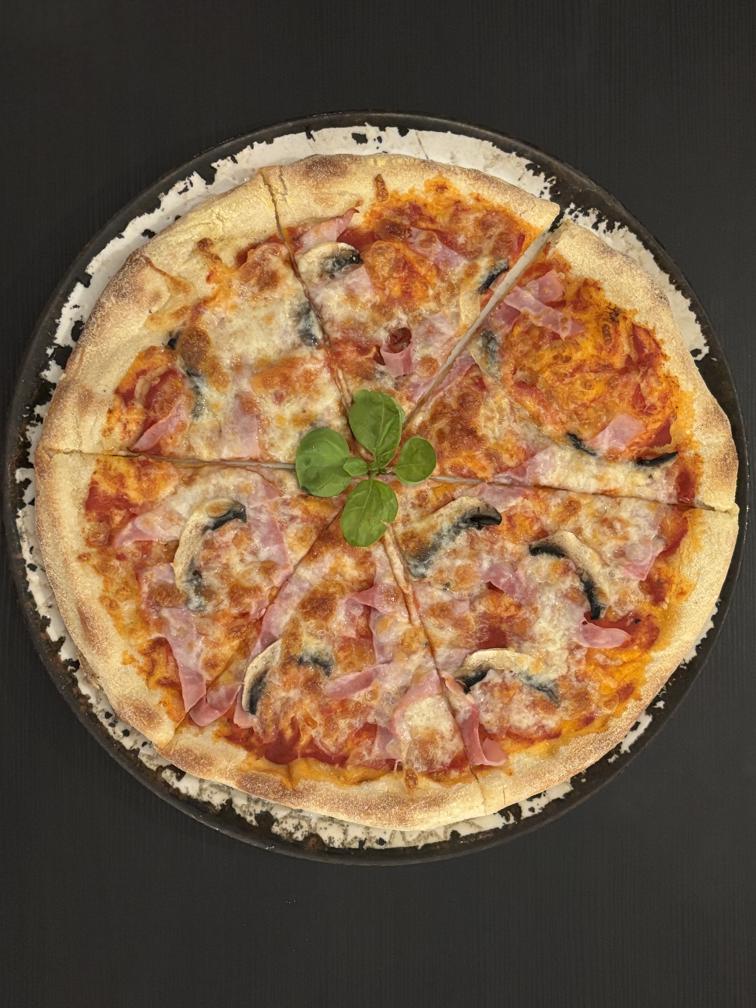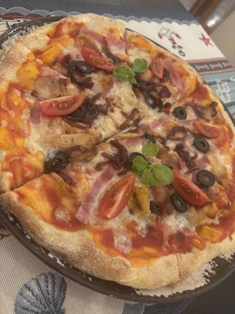 Доматен сос, пил. месо, шунка, гъби, маслини и моцарела / Tomato sauce, chicken, ham, caramelized onions, olives and mozzarella