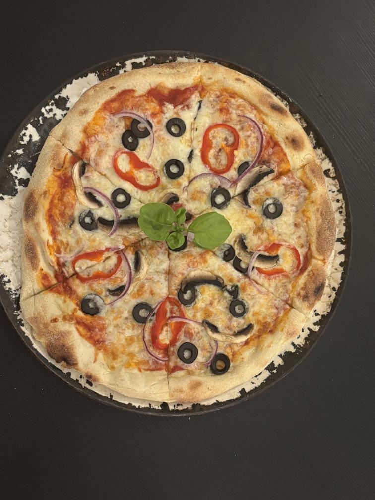 доматен сос, маслини, пипер, гъби, червен лук и моцарела / tomato sauce, olives, peppers, mushrooms, red onion and mozzarella