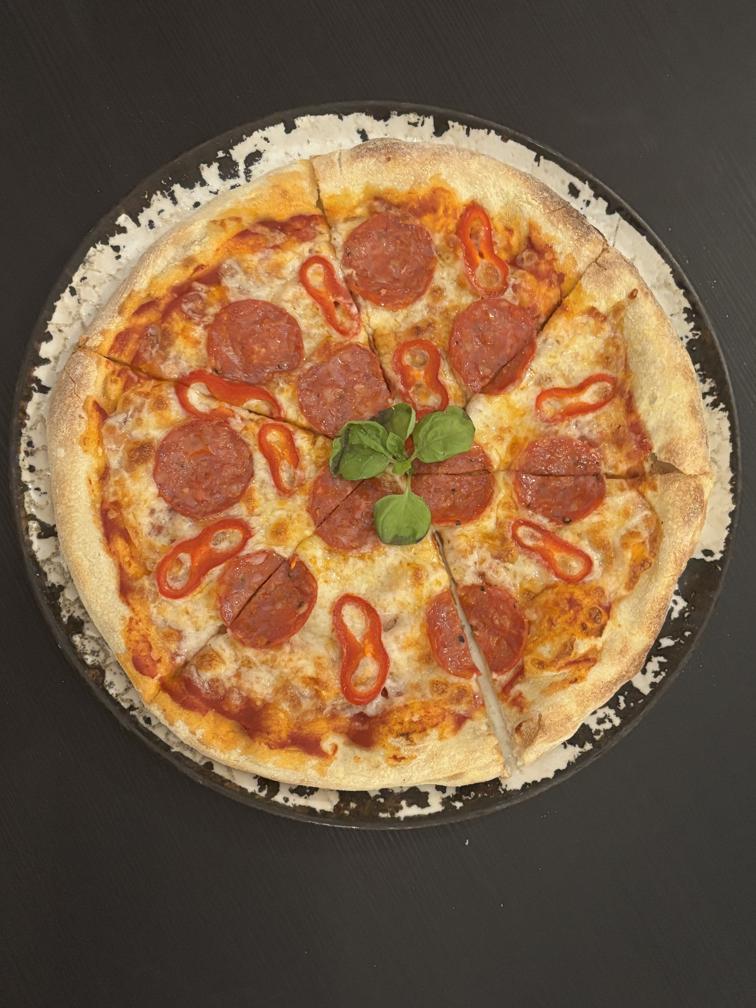 Доматен сос, салам, маслини, пипер и моцарела / tomato sauce, salami, olives, peppers and mozzarella