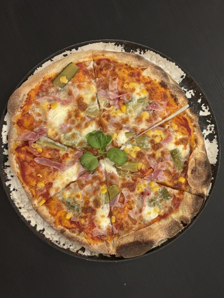 Доматен сос, кисали краставички, пиле, царевица, топено сирене и моцарела / Tomato sauce, pickles, chicken, corn, melted cheese and mozzarella