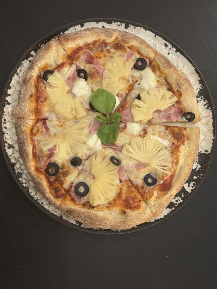 доматен сос, топено сирене, шунка, ананс, маслини и моцарела / tomato sauce, melted cheese, ham, pineapple, olives and mozzarella