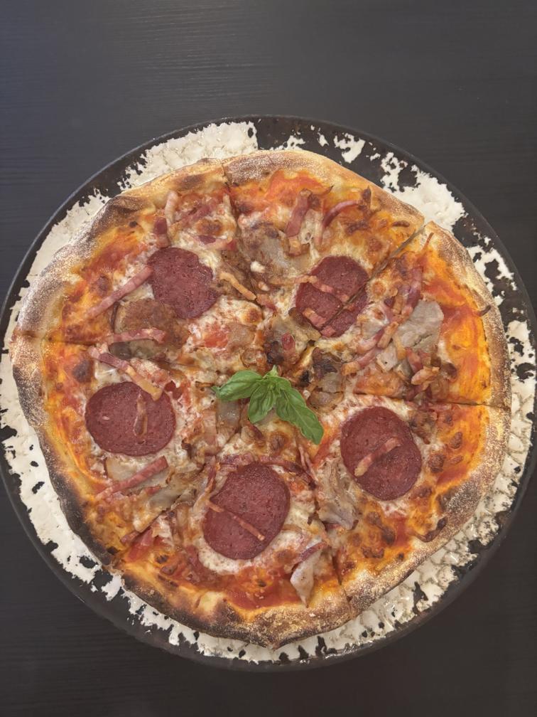 доматен сос, луканка, св. месо, бекон и моцарела / tomato sauce, sausage, pork, bacon and mozzarella
